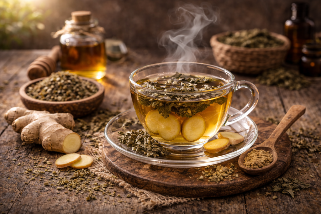 Seasonal sensitivity was traditionally addressed through gentle clearing and movement. Light, leafy herbs were commonly infused rather than simmered.This infusion